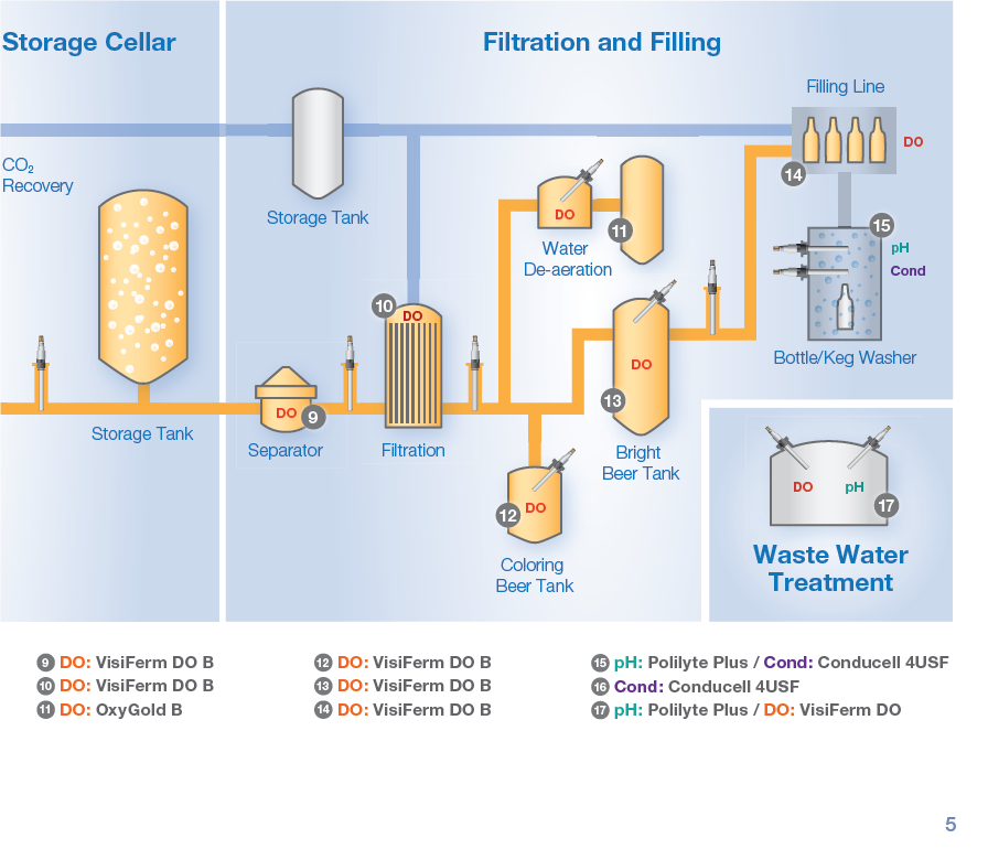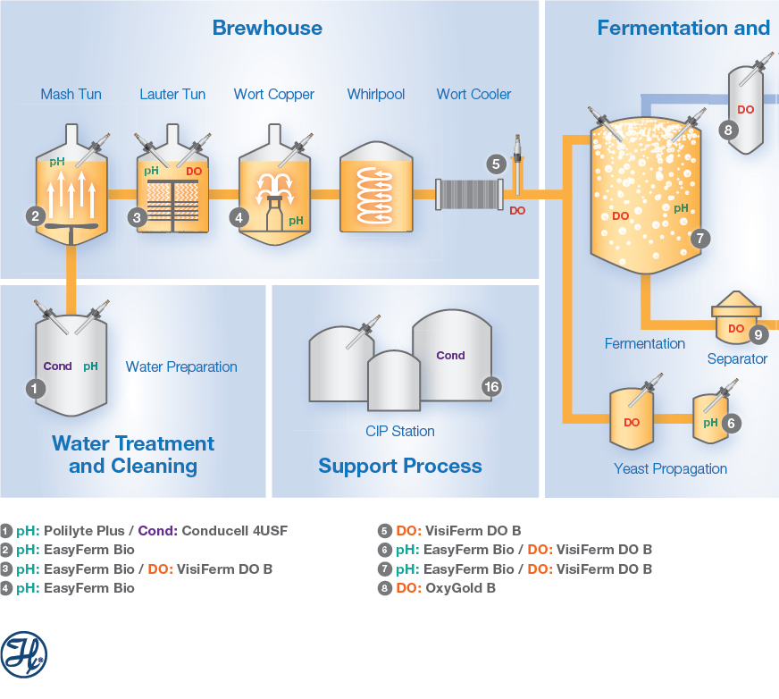* Qúa trình xử lý Inline được kiểm tra bởi các loại điện cực đo pH, độ dẫn điện, oxy hòa tan đo trực tiếp trên các bồn ủ men, bồn lọc dịch bia, hèm rượu, bồn tách, bồn chứa bia có màu, các hệ thống xử lý nước và làm sạch, trạm CIP station, quá trình đóng rót chai.